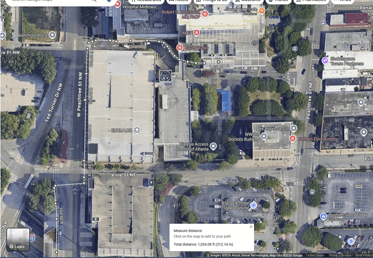 10.5 driving miles to conference site, Emory University Hospital Midtown Glenn Bldg., 550 Peachtree St. NE, Atlanta GA 30308. Distances to hotels arranged by P-POD are shown in our HOTELS section below.